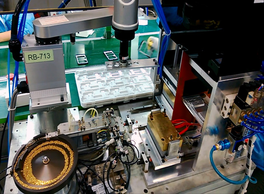 項目為一個電子產(chǎn)品的整機組裝,利用六軸機械手搭配周邊輔助設(shè)備,模塊式作業(yè),實現(xiàn)全自動生產(chǎn)。其中包含電池的組裝,PCB電路板軟體的燒制及檢測,激光打碼,螺絲的組裝,CCD檢測,通電檢測,全自動裝箱,全自動上料。四軸機器人配合熱熔埋螺母,效率提升四倍有效節(jié)省人力提高品質(zhì)穩(wěn)定性。